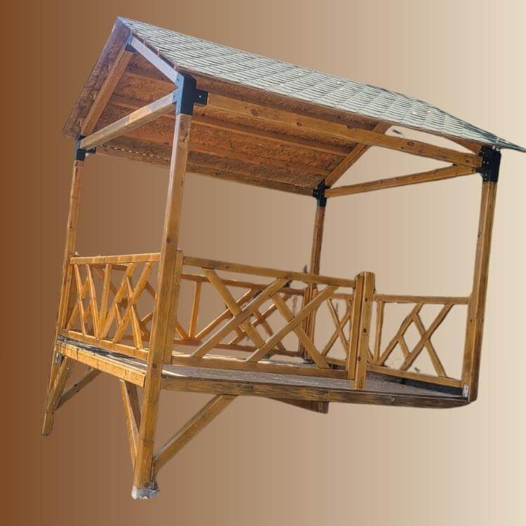 Letnjikovac sa lameniranim gredama 100x100mm i spojevi su sa kutijastim profilima koji su plastificirani, dimenzija je 300×300 cm, pokrijen sa tegolom.